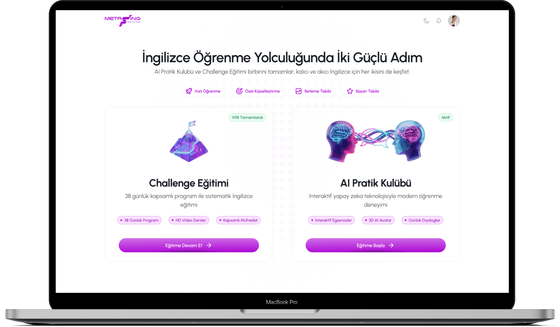 Meta İngilizce, yalnızca ders izlediğiniz bir platform sunmaz. Eğitim paneli üzerinden öğrenir, yapay zeka entegrasyonu ile pratik yapar, diğer öğrenciler ile konuşur ve tüm yolculuğunuzu buradan takip edersiniz.
